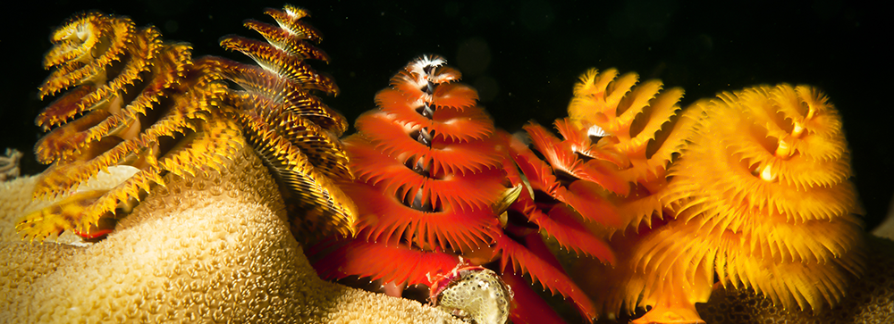Christmas Tree Worms: This is a very colorful worm that has spectacular plumes that spiral to resemble a fir tree. It comes in festive colors of red, yellow, blue and orange. They are essential to our coral reefs as they protect them from being eaten by crown-of-thorns starfish.